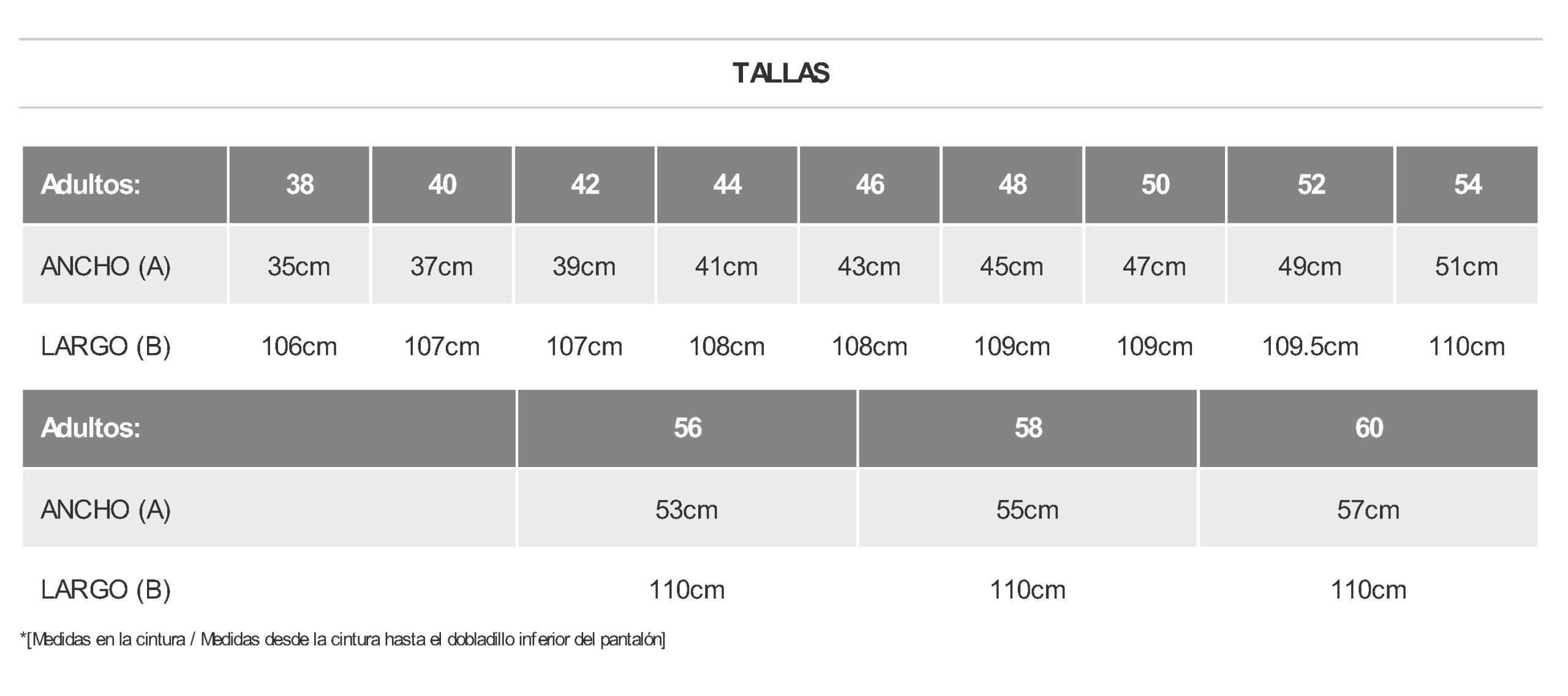Tallas adulto: 38 · 40 · 42 · 44 · 46 · 48 · 50 · 52 · 54 · 56 · 58 · 60